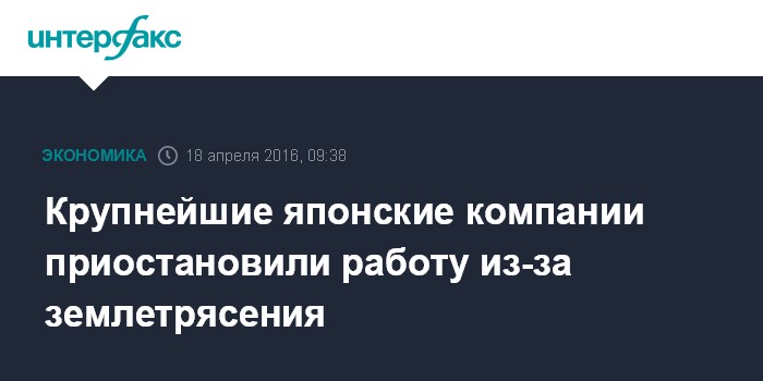 Москва. 18 апреля. INTERFAX.RU - Крупнейшие японские компании, включая автопроизводителей Toyota, Honda и Nissan, а также производителей электроники Sony и Fujifilm, приостановили работу своих предприятий в зоне, пострадавшей от самого разрушительного землетрясения с 2011 года, сообщает агентство Bloomberg.