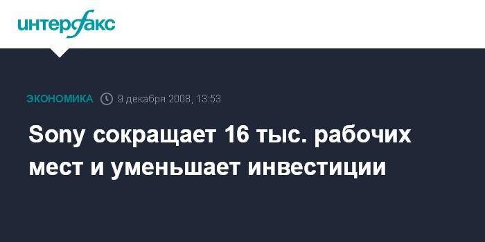 Москва. 9 декабря. INTERFAX.RU - Второй по величине производитель бытовой электроники в мире Sony Corp. заявил о сокращении 8 тыс. рабочих мест и уменьшении инвестиций в электронную отрасль, поскольку "острый экономический спад" негативно отражается на его прибыльности, говорится в распространенном во вторник пресс-релизе компании. Старший вице-президент компании Наофуми Нара заявил в интервью японским СМИ, что будут уволены еще 8 тыс. сотрудников, работающих на контрактной основе. Таким образом, всего компания сократит 16 тыс. рабочих мест.