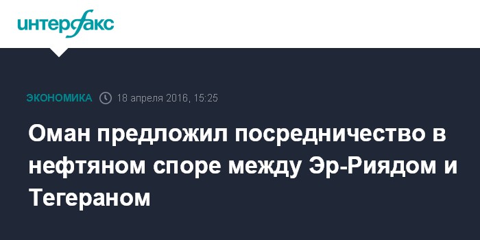 Москва. 18 апреля. INTERFAX.RU - Оман, крупнейший в Персидском заливе экспортер нефти вне ОПЕК, предложил помощь в преодолении разногласий между Саудовской Аравией и Ираном, которые помешали нефтепроизводителям договориться об ограничении добычи на встрече в Дохе в воскресенье.