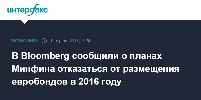 Москва. 18 апреля. INTERFAX.RU - Минфин РФ откладывает планировавшийся на 2016 год выпуск еврооблигаций из-за санкций США и Евросоюза, а также неформального требования американских и европейских регуляторов к банкам не участвовать в размещении суверенных евробондов РФ, сообщило агентство Bloomberg со ссылкой на двух высокопоставленных чиновников.