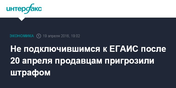 Москва. 19 апреля. INTERFAX.RU - Около четырех процентов организаций розничной торговли алкоголем, не подключившихся к ЕГАИС (Единая государственная автоматизированная система учета алкоголя), после 20 апреля могут быть оштрафованы.