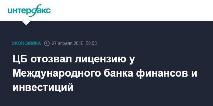 Москва. 27 апреля. INTERFAX.RU - Центральный банк России отозвал лицензию на осуществление банковских операций у Международного банка финансов и инвестиций (Москва), говорится в сообщении регулятора.