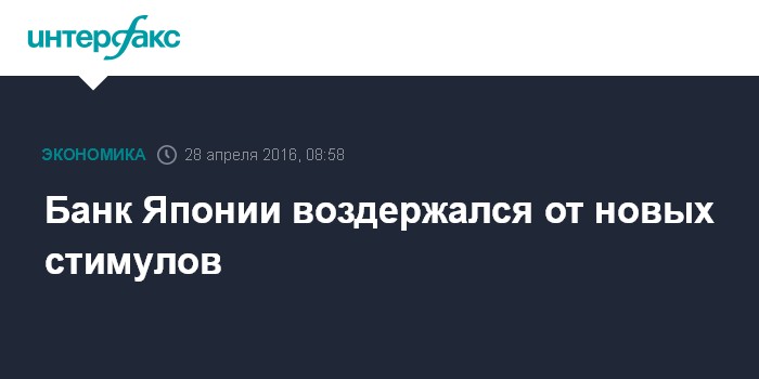 Москва. 28 апреля. INTERFAX.RU - Банк Японии, вопреки ожиданиям многих участников рынка, по итогам очередного заседания сохранил без изменений курс денежно-кредитной политики и не стал расширять стимулирующие меры.