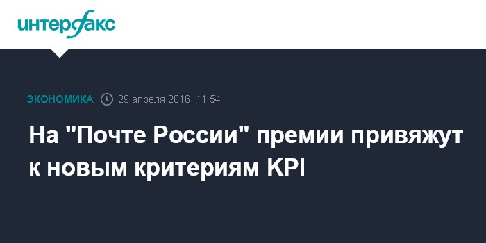 Москва. 29 апреля. INTERFAX.RU - ФГУП "Почта России" с первого июля введет новую систему ключевых показателей эффективности (KPI) для работников почтовых отделений, к которой будут привязаны ежемесячные премии.