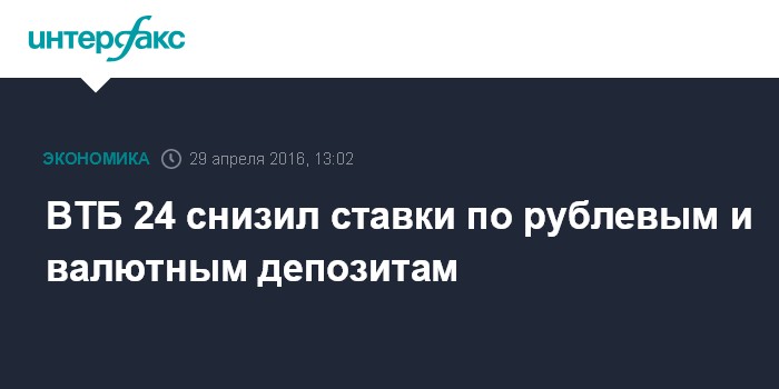 Москва. 29 апреля. INTERFAX.RU - Банк ВТБ 24 снизил ставки по рублевым и валютным депозитам, сообщили "Интерфаксу" в пресс-службе кредитной организации.