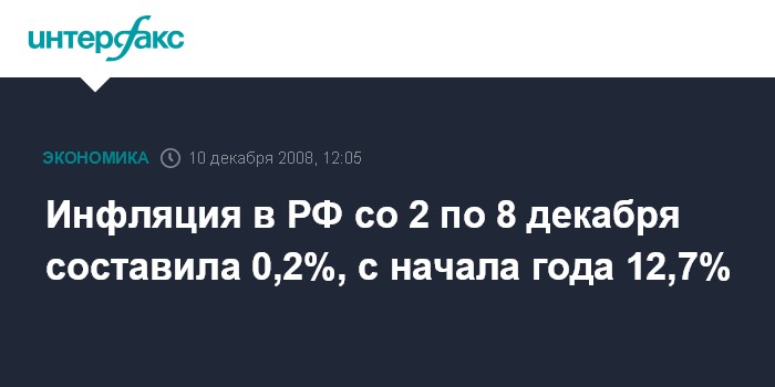 Москва. 10 декабря. INTERFAX.RU - Инфляция в РФ за период со 2 по 8 декабря составила 0,2%, сообщил "Интерфаксу" источник в одном из ведомств финансово-экономического блока со ссылкой на данные Росстата.