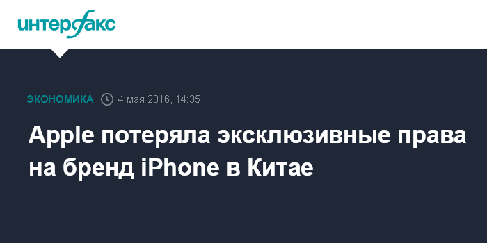 Москва. 4 мая. INTERFAX.RU - Американская компания Apple проиграла судебное дело в Китае, потеряв тем самым эксклюзивное право на использование бренда iPhone в стране, сообщает BBC.