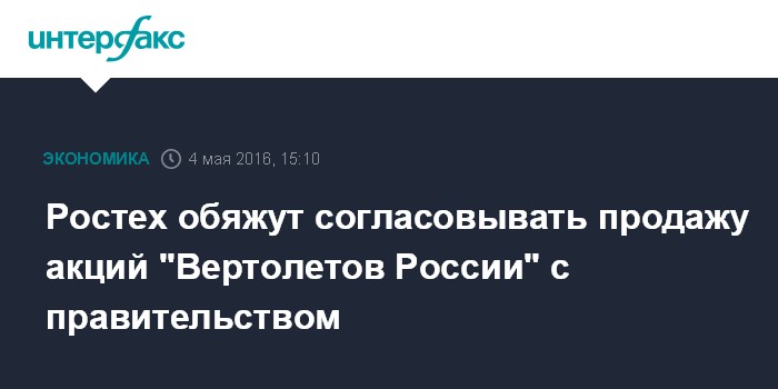 Москва. 4 мая. INTERFAX.RU - Минэкономразвития РФ одобрило проект постановления правительства, который обязывает госкорпорацию "Ростех" согласовывать продажу акций "Вертолетов России" и "Объединенной двигателестроительной корпорации" (ОДК) с правительством, сообщил "Интерфаксу" источник, знакомый с ходом подготовки документа.