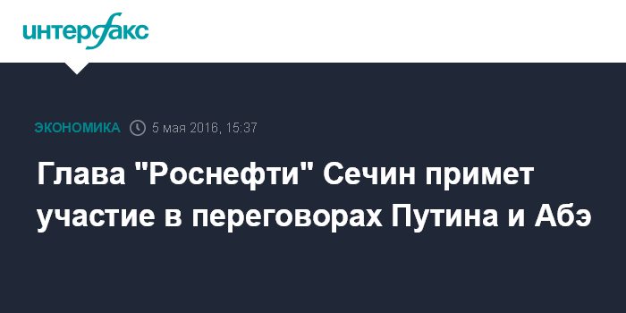 Москва. 5 мая. INTERFAX.RU - Переговоры президента РФ Владимира Путина и премьера Японии Синдзо Абэ в расширенном составе, которые состоятся в Сочи шестого мая, пройдут при участии главы НК "Роснефть" Игоря Сечина, сообщил журналистам помощник главы российского государства Юрий Ушаков.