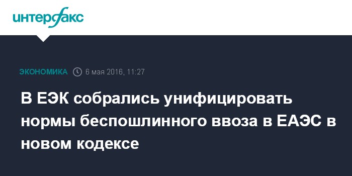 Москва. 6 мая. INTERFAX.RU - Евразийская экономическая комиссия (ЕЭК) надеется на унификацию всех норм беспошлинного ввоза для стран Евразийского экономического союза (ЕАЭС) в новом Таможенном кодексе. Кодекс, как ранее сообщалось, может заработать в 2017 году.