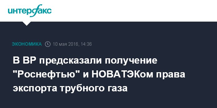 Москва. 10 мая. INTERFAX.RU - "Роснефть" и "НОВАТЭК" получат право экспорта трубопроводного газа в Европу, уверен главный экономист британской ВР (владеет почти 20% "Роснефти") Владимир Дребенцов.