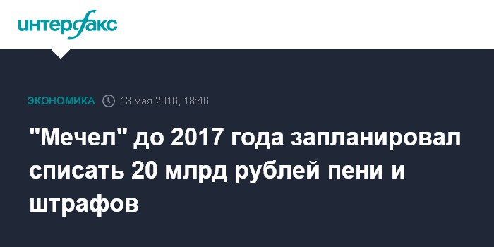 Москва. 13 мая. INTERFAX.RU - Топ-менеджмент ПАО "Мечел" планирует списание 20 млрд руб. пени и штрафов перед кредиторами в течение 2016 и 2017 гг., заявил вице-президент по финансам компании Андрей Сливченко в ходе телефонной конференции в пятницу.