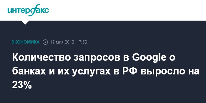 Москва. 17 мая. INTERFAX.RU - Количество запросов российских пользователей в поисковой системе Google, касающихся банков, их услуг и продуктов в первом квартале 2016 года выросло на 23% в сравнении с показателем первого квартала 2015 года, говорится в сообщении поисковика.