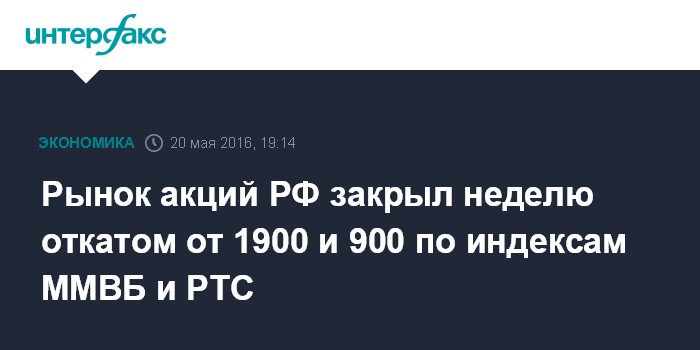 Москва. 20 мая. INTERFAX.RU - Рынок акций РФ завершил неделю откатом ниже пограничных уровней 1900 и 900 пунктов по индексам ММВБ и РТС из-за приостановки ралли в нефти и общемировых продаж рисковых активов в свете ожиданий повышения ставки Федрезерва США в июне.
