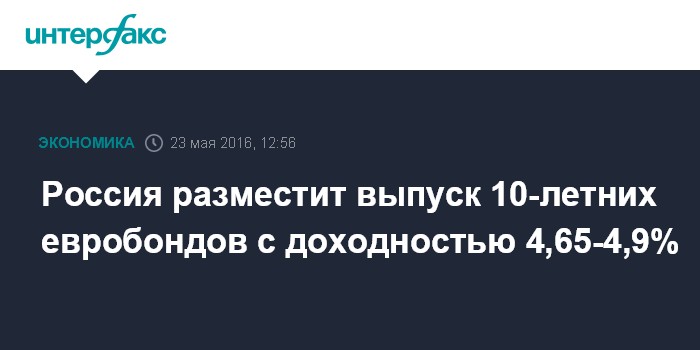Москва. 23 мая. INTERFAX.RU - Россия размещает выпуск десятилетних суверенных еврооблигаций, номинированных в долларах США, ориентир доходности долговых бумаг составляет 4,65-4,9% годовых, сообщил "Интерфаксу" источник в банковских кругах.