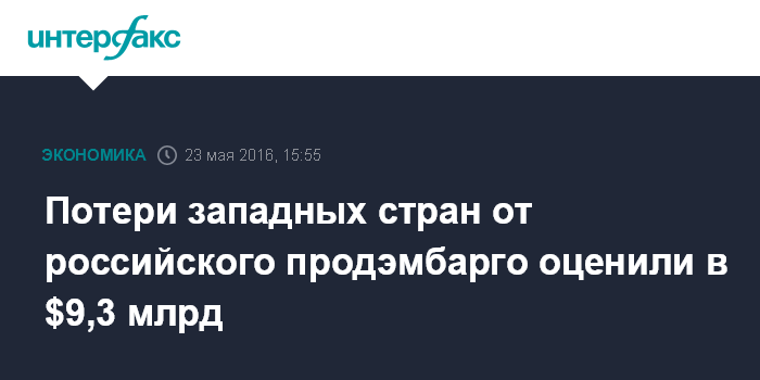 Москва. 23 мая. INTERFAX.RU - Западные страны потеряли от российского продэмбарго 9,3 млрд долларов, посчитали эксперты аналитического центра при правительстве России в своем докладе". Продовольственное эмбарго: итоги 2015 года". Введение в 2014 году и последующее расширение продовольственного эмбарго шло по пути охвата все большего количества стран и списка санкционных товаров. По охвату первая волна эмбарго оказалось самой масштабной: под ее действие подпал объем импорта в Россию примерно на 9,1 млрд