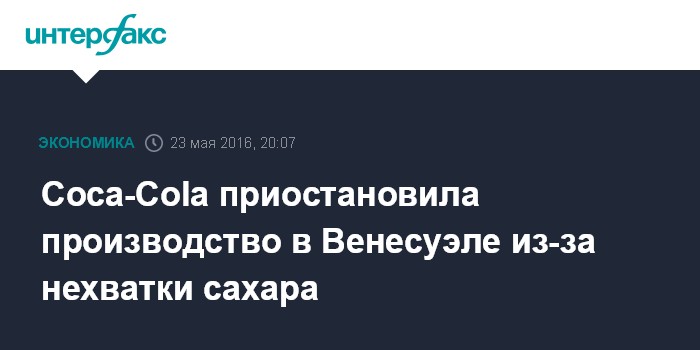 Москва. 23 мая. INTERFAX.RU - Coca-Cola приостановила производство напитков в Венесуэле из-за дефицита сахара, говорится в сообщении мексиканской компании Coca-Cola FEMSA - крупнейшей корпорации по розливу продукции Coca-Cola в мире, работающей практически на всех рынках Латинской Америки.
