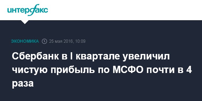 Москва. 25 мая. INTERFAX.RU - Сбербанк России в первом квартале 2016 года увеличил чистую прибыль по МСФО почти в 3,85 раза (на 284,6%) - до 117,7 млрд рублей, говорится в пресс-релизе банка.