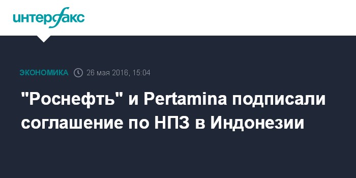 Москва. 26 мая. INTERFAX.RU - НК "Роснефть" и Pertamina подписали соглашение о строительстве НПЗ в Индонезии, пишет Bloomberg со ссылкой на сообщение индонезийской компании.