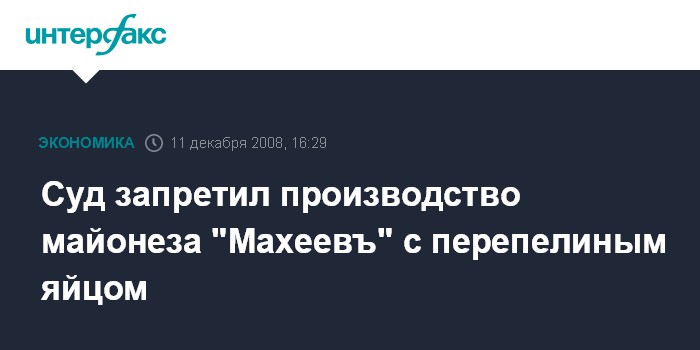 "Суд запретил "Эссен Продакшн АГ" производить, предлагать к продаже, продавать и хранить с этой целью майонез "Махеевъ с перепелиным яйцом". Решение суда обязывает производителя изъять из продажи и полностью уничтожить существующие запасы контрафактного продукта. Кроме того, нарушитель обязан компенсировать истцу судебные издержки, а также оплатить публикацию решения суда в СМИ", - говорится в пресс-релизе.