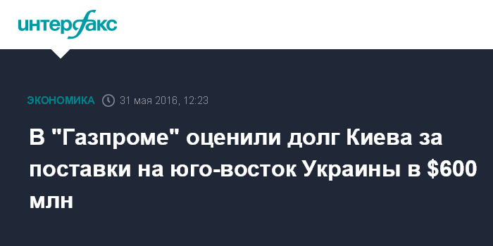 Москва. 31 мая. INTERFAX.RU - Сумма задолженности "Нафтогаза Украины" за поставки газа на юго-восток Украины составляет $600 млн, сообщил журналистам зампред правления "Газпрома" Александр Медведев.