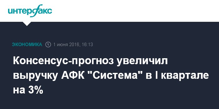 Москва. 1 июня. INTERFAX.RU - Выручка АФК "Система" в I квартале 2016 года составила 172,6 млрд рублей, что на три процента больше показателя аналогичного периода 2015 года, свидетельствует консенсус-прогноз "Интерфакса", основанный на оценках аналитиков восьми инвестиционных компаний и банков.