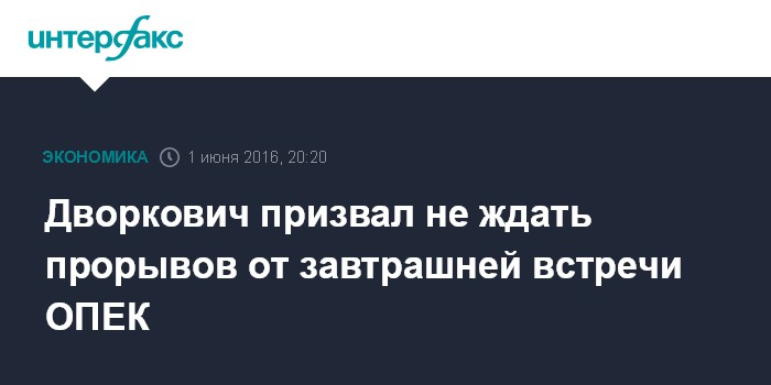 Москва. 1 июня. INTERFAX.RU - Россия не ждет каких-либо новых решений от встречи ОПЕК, открывающейся в четверг в Вене. Вице-премьер РФ Аркадий Дворкович прокомментировал журналистам: "Мы не ждем ничего конкретного. Продолжится обыкновенная дискуссия. Вряд ли можно ждать каких-то прорывов".