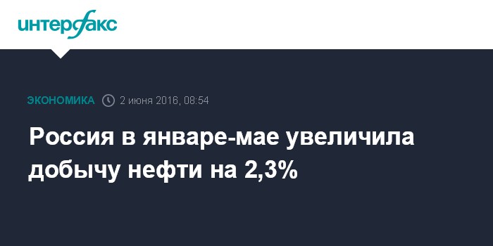 Москва. 2 июня. INTERFAX.RU - Добыча нефти с газовым конденсатом в России в январе-мае 2016 года составила 225,462 млн тонн, что на 2,3% выше аналогичного показателя за 2015 год. Такие данные содержатся в оперативной сводке ГП "ЦДУ ТЭК".