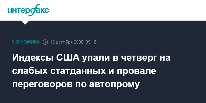 Москва. 12 декабря. INTERFAX.RU - Фондовые индексы в США упали по итогам торгов в четверг из-за провала переговоров по поводу плана спасения автомобильной промышленности страны и слабых статистических данных, сообщает агентство Bloomberg.