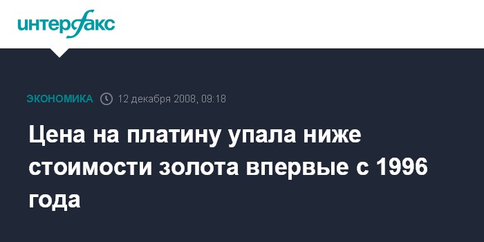 Москва. 12 декабря. INTERFAX.RU - Цена на платину опустилась в пятницу ниже стоимости золота впервые с 1996 года после сообщения о том, что законопроект о помощи автопрому США не набрал необходимого числа голосов в Сенате, так как республиканцы и демократы, несмотря на длительные переговоры, не смогли достичь соглашения по деталям плана.