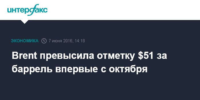 Москва. 7 июня. INTERFAX.RU - Нефть марки Brent в ходе торгов во вторник превысила отметку $51 за баррель впервые с 12 октября прошлого года.