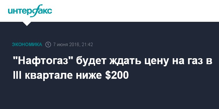 Москва. 7 июня. INTERFAX.RU - НАК "Нафтогаз Украины" рассчитывает на цену закупки импортного газа в третьем квартале 2016 года ниже $200 за 1 тыс. куб. м, сообщил глава правления НАК Андрей Коболев.
