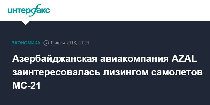 Москва. 8 июня. INTERFAX.RU - Азербайджанский национальный авиаперевозчик AZAL возьмет в лизинг у "Ильюшин Финанс Ко" самолеты МС-21, соответствующее соглашение о намерениях подписано в рамках церемонии презентации первого лайнера в среду в Иркутске.