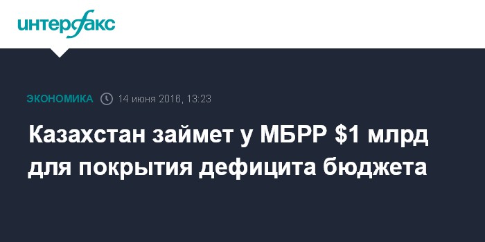Москва. 14 июня. INTERFAX.RU - Казахстан привлечет в Международном банке реконструкции и развития (МБРР, входит в группу Всемирного банка) заем в размере $1 млрд для финансирования дефицита республиканского бюджета в 2016 году.