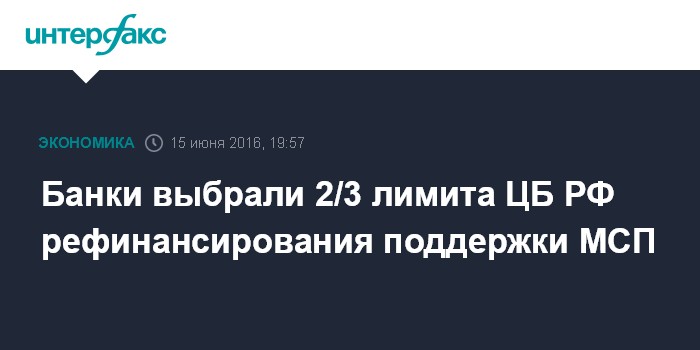 Москва. 15 июня. INTERFAX.RU - Кредитные учреждения на текущий момент выбрали почти 50 млрд рублей из 75 млрд рублей лимита специнструмента рефинансирования ЦБ РФ для поддержки малого и среднего бизнеса (МСП), сообщил журналистам первый заместитель председателя Банка России Дмитрий Тулин в кулуарах второго Российского форума малого и среднего предпринимательства в рамках ПМЭФ-2016 в Петербурге в среду.