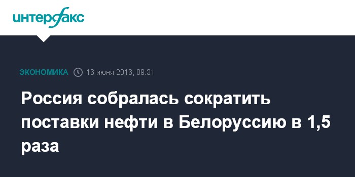 Москва. 16 июня. INTERFAX.RU - Россия планирует в третьем квартале 2016 года сократить поставки нефти в Белоруссию в 1,5 раза по сравнению со вторым кварталом, сообщили "Интерфаксу" источники в отрасли.