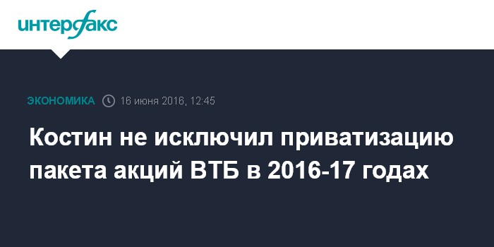Москва. 16 июня. INTERFAX.RU - Пакет акций ВТБ может быть приватизирован в 2016-2017 годах, сказал журналистам глава ВТБ Андрей Костин.