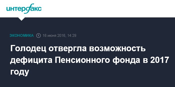 Москва. 16 июня. INTERFAX.RU - Дефицита Пенсионного фонда в 2017 году не ожидается, заявила в четверг вице-премьер РФ Ольга Голодец.