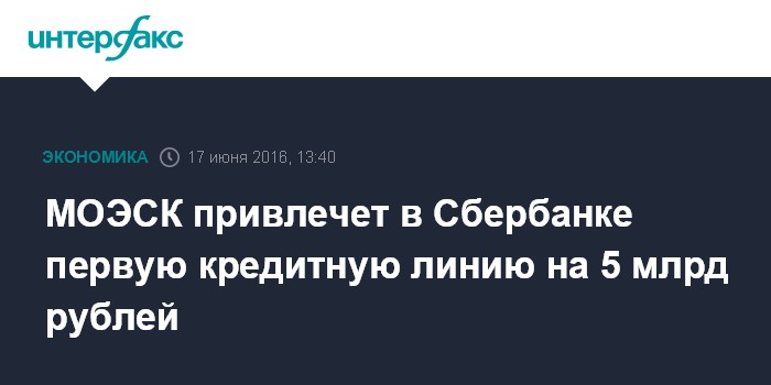 Москва. 17 июня. INTERFAX.RU - ПАО "МОЭСК" и Сбербанк заключили соглашение о предоставлении первой из трех кредитных линий для сетевой компании в объеме 5 млрд руб.