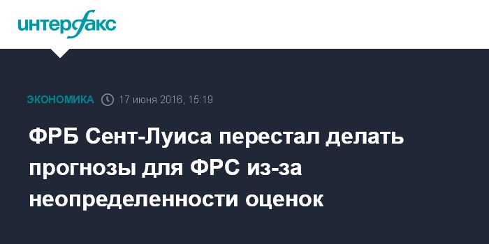 Москва. 17 июня. INTERFAX.RU - Федеральный резервный банк (ФРБ) Сент-Луиса с июня перестал предоставлять долгосрочные макроэкономические прогнозы для сводных таблиц Федеральной резервной системы (ФРС), публикуемых четыре раза в год, говорится в сообщении председателя ФРБ Джеймса Балларда.