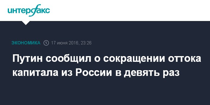 Москва. 17 июня. INTERFAX.RU - Отток капитала из России сократился в разы, заявил президент РФ Владимир Путин.