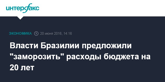 Москва. 20 июня. INTERFAX.RU - Временное правительство Бразилии планирует заморозить бюджетные расходы на срок до 20 лет наряду с принятием ряда других мер для стабилизации экономики и сдерживания роста госдолга.