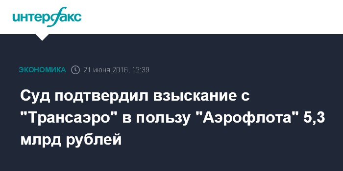 "Аэрофлот" предложил поделиться частью парка "Трансаэро" с другими перевозчикамиЧитать подробнееРанее сообщалось, что седьмого декабря 2015 года Арбитражный суд Москвы решил взыскать с "Трансаэро" в пользу "Аэрофлота" 5,3 млрд рублей долга по договору займа. Суд тогда по ходатайству "Аэрофлота" уменьшил сумму взыскания с 5,8 млрд рублей до 5,3 млрд рублей в связи с отказом от взыскания штрафа и прекратил производство по делу в части взыскания штрафа в размере 500 млн рублей.