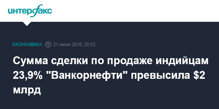 Москва. 21 июня. INTERFAX.RU - Сумма сделки по продаже 23,9% "Ванкорнефти" консорциуму индийских компаний Oil India, Indian Oil и Bharat Petroresources составила более $2 млрд, подтвердил глава "Роснефти" Игорь Сечин информацию источников "Интерфакса" в интервью телеканалу "Россия 24".