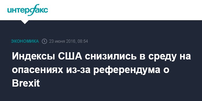 Москва. 23 июня. INTERFAX.RU - Фондовые индексы США снизились по итогам торгов среды на фоне сохраняющихся опасений по поводу итогов предстоящего в четверг референдума о членстве Великобритании в Евросоюзе.