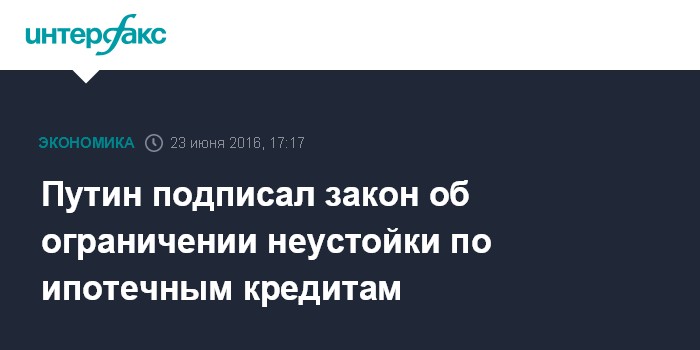 Москва. 23 июня. INTERFAX.RU - Президент РФ Владимир Путин подписал закон, который ограничивает размер неустойки за неисполнение или ненадлежащее исполнение ипотечного кредитного договора физическими лицами.
