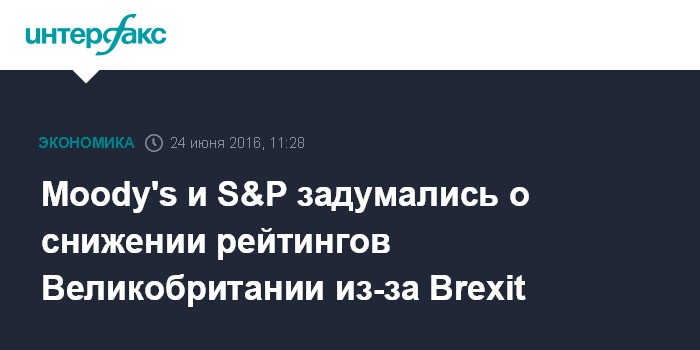 Москва. 24 июня. INTERFAX.RU - Выход Великобритании из Евросоюза (Brexit) будет иметь негативные последствия для кредитоспособности страны и может привести к снижению ее рейтингов, заявили два из ведущих мировых рейтинговых агентств - S&P Global Ratings и Moody's Investors Service.