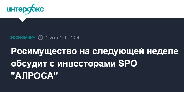Москва. 24 июня. INTERFAX.RU - Росимущество на следующей неделе встретится с агентом по приватизации "АЛРОСА" - Sberbank CIB, а также с представителями РФПИ и зарубежных инвесторов, заинтересованных в участии в SPO алмазодобытчика.