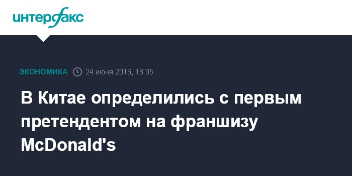 Москва. 24 июня. INTERFAX.RU - Китайские компании Sanpower и Beijing Tourism Group сделали совместное предложение о приобретении франшизы McDonald's в Китае, сообщает BBC.