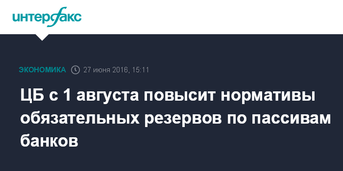 Москва. 27 июня. INTERFAX.RU - ЦБ РФ С первого августа 2016 года повышает на 0,75 процентного пункта (п.п.) нормативы обязательных резервов по обязательствам банков в рублях и в иностранной валюте, говорится в пресс-релизе регулятора.